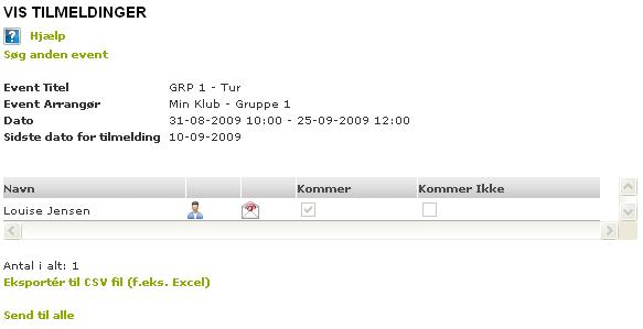 Hvis det ønskes, kan du eksportere deltagerlisten til fx. Excel ved at klikke på linket ovenover "Eksportér til CSV fil (f.eks. Excel)".