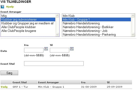Herefter finder du den event du til se deltagerne for. Du kan søge efter eventen ud fra nedenstående kriterier. Klik på knappen "Søg" efter du har valgt dine kriterier: