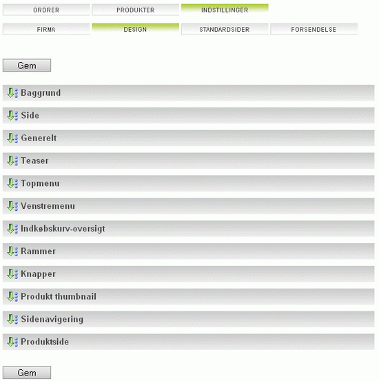 Under fanen "Design" kan du ændre udseendet af din webshop, hvilket inkluderer baggrund, skrifttype, bannere, linkt, farver mm.